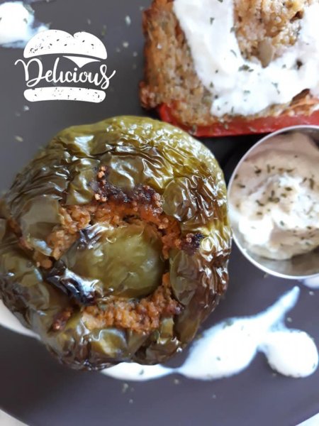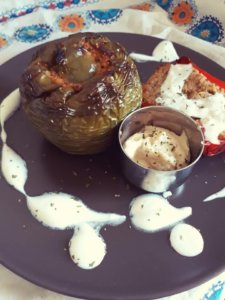 Egy sütőpapírral kibélelt tepsire állítsuk a már megtöltött paprikákat – én alaposan belenyomkodtam a brokkolis tölteléket, hogy a paprika aljára és oldalára is bőven jusson belőle. A pici kis talpacskát, amit korábban levágtunk a paprika aljáról, most használhatjuk “sapkának”, megkoronázva a töltött paprikáinkat. Meglocsoljuk őket egy kevés olívaolajjal, és mehet is az előmelegített sütőbe. 35-40 perc alatt kész is kell hogy legyen ez a mennyei finomság. Önmagában is laktató, ám tálalhatjuk ízlésünk szerinti salátával, vagy akár egy kevés petrezselymes krumplival is. Én most csak humuszt és fokhagymás joghurtot szervíroztam mellé. Így nekem – aki nagy haspók – elég volt ebédre 1,5 töltött paprika.